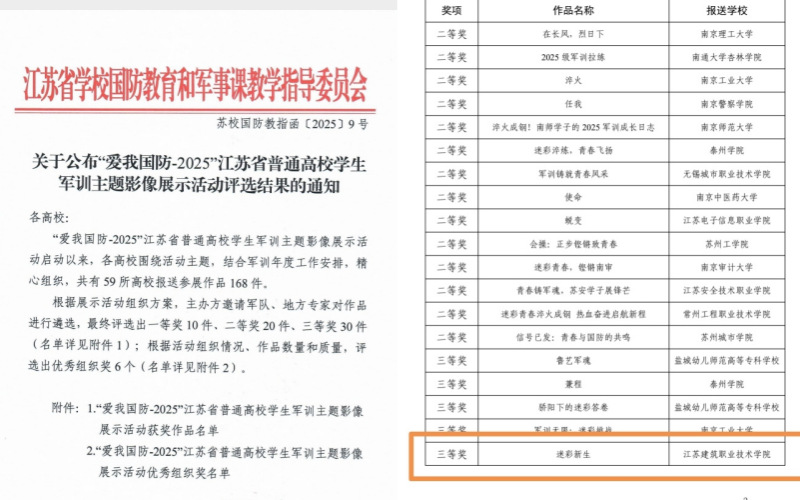 同期,在省美狮贵宾会国防教育和军事课教学指导委员会主办的“爱我国防-2025”军训主题影像展示活动中,我校报送的作品《迷彩新生》获省级三等奖。