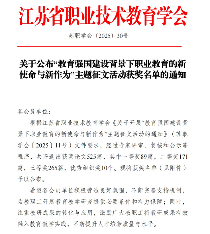 据悉,本次征文活动以“教育强国建设背景下职业教育的新使命与新作为”为主题,立足职业教育服务国家战略的使命,紧扣职普融通、关键办学能力提升等内容,聚焦职业院校在深化产教融合、推动教学改革中的实践,重点展现江苏职业教育教学改革发展的创新举措和经验。今年五月份,江苏省职业技术教育学会下发了《关于开展“教育强国建设背景下职业教育的新使命与新作为”主题征文活动的通知》(苏职学会〔2025〕11号)。通知发布后,省职教学会共收到征文900篇,经过专家评审、复核和公示等程序,共评选出获奖论文525篇,其中一等奖89篇,二等奖171篇,三等奖265篇,优秀组织奖10个。