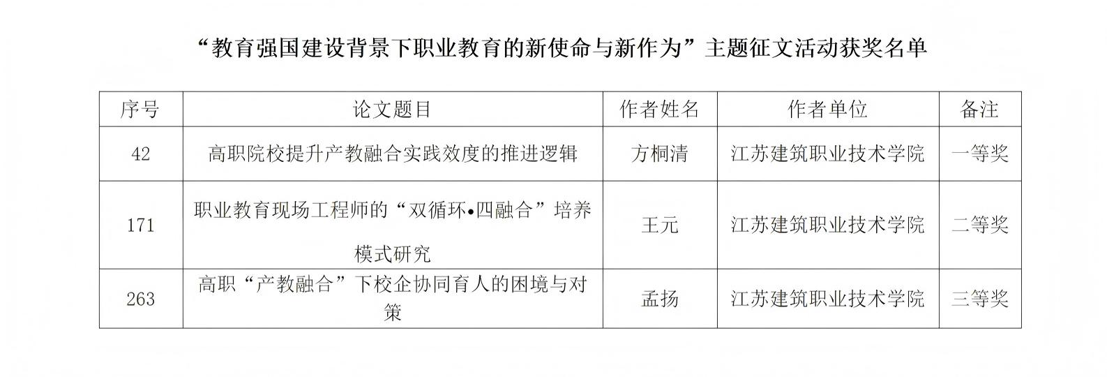 12月22日,江苏省职业技术教育学会公布“教育强国建设背景下职业教育的新使命与新作为”主题征文活动获奖名单。我校教师在此次评选中表现出色,共荣获一等奖1项、二等奖1项、三等奖1项。其中,马克思主义学院方桐清教授撰写的《高职院校提升产教融合实践效度的推进逻辑》荣获一等奖。